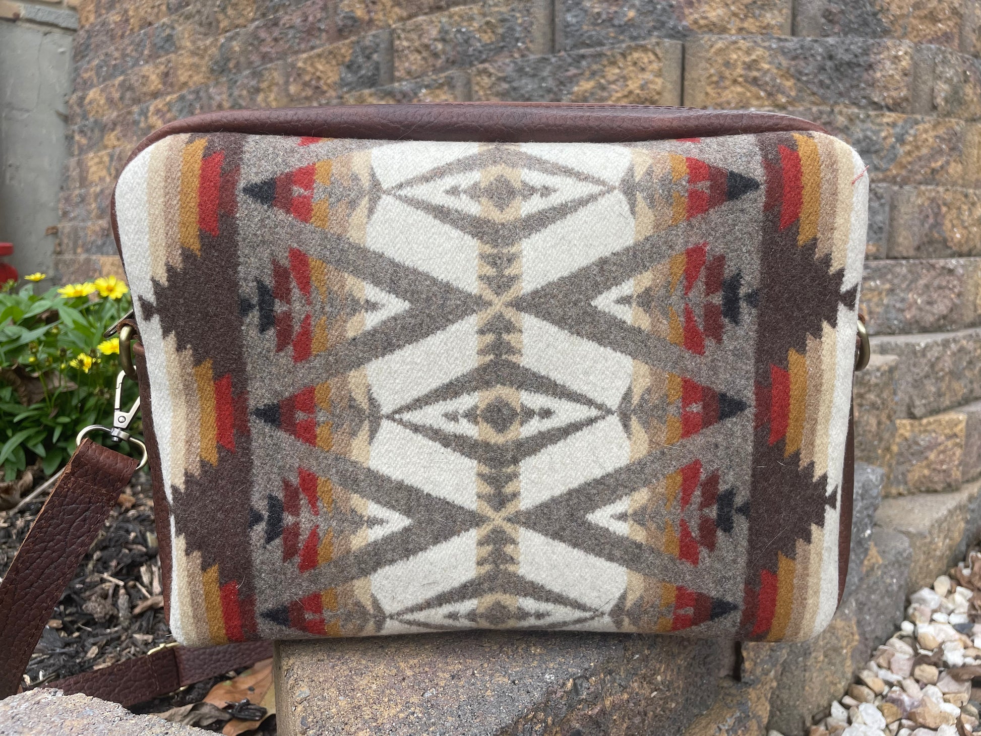 Pendleton Wool & Bison leather, two way zip closure. Large interior Slip pocket has divider.